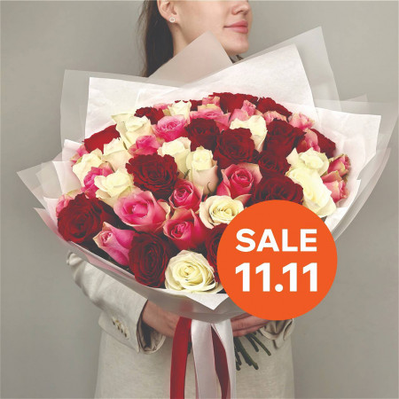 Роза 50 см БЕЛАЯ (Кения) - 35;Лента атласная - 2;Современная упаковка - 1;Роза 50 см КРАСНАЯ (Кения) - 33;Роза 50 см РОЗОВАЯ (Кения) - 33;