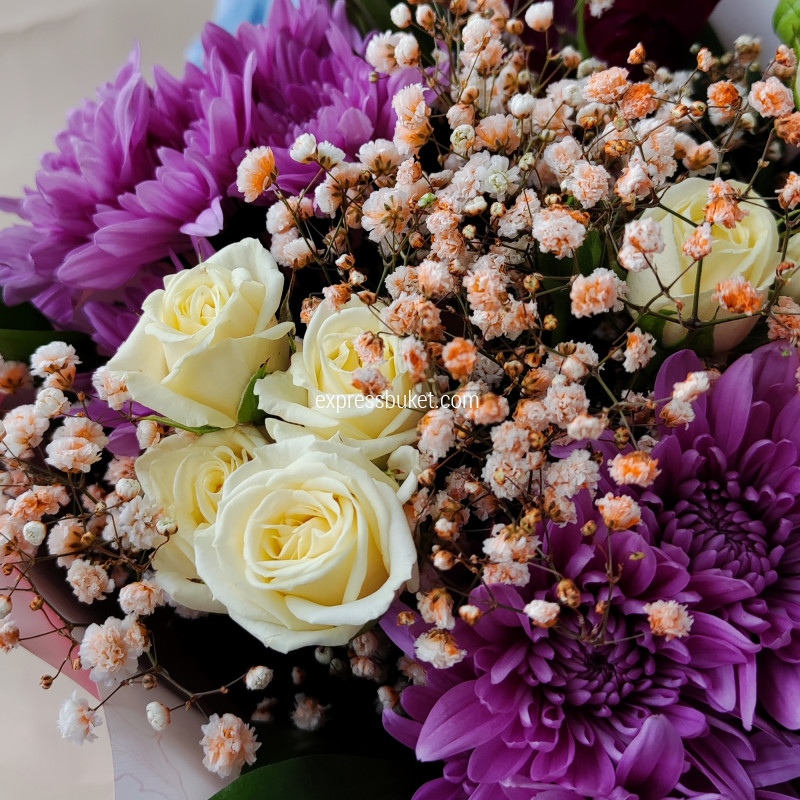 Мастерство флориста проявляется, в том числе в умении комбинировать оттенки и создавать настроение. Посмотрите, как красиво и гармонично сочетаются кремовый, светло-розовый и фиолетовый